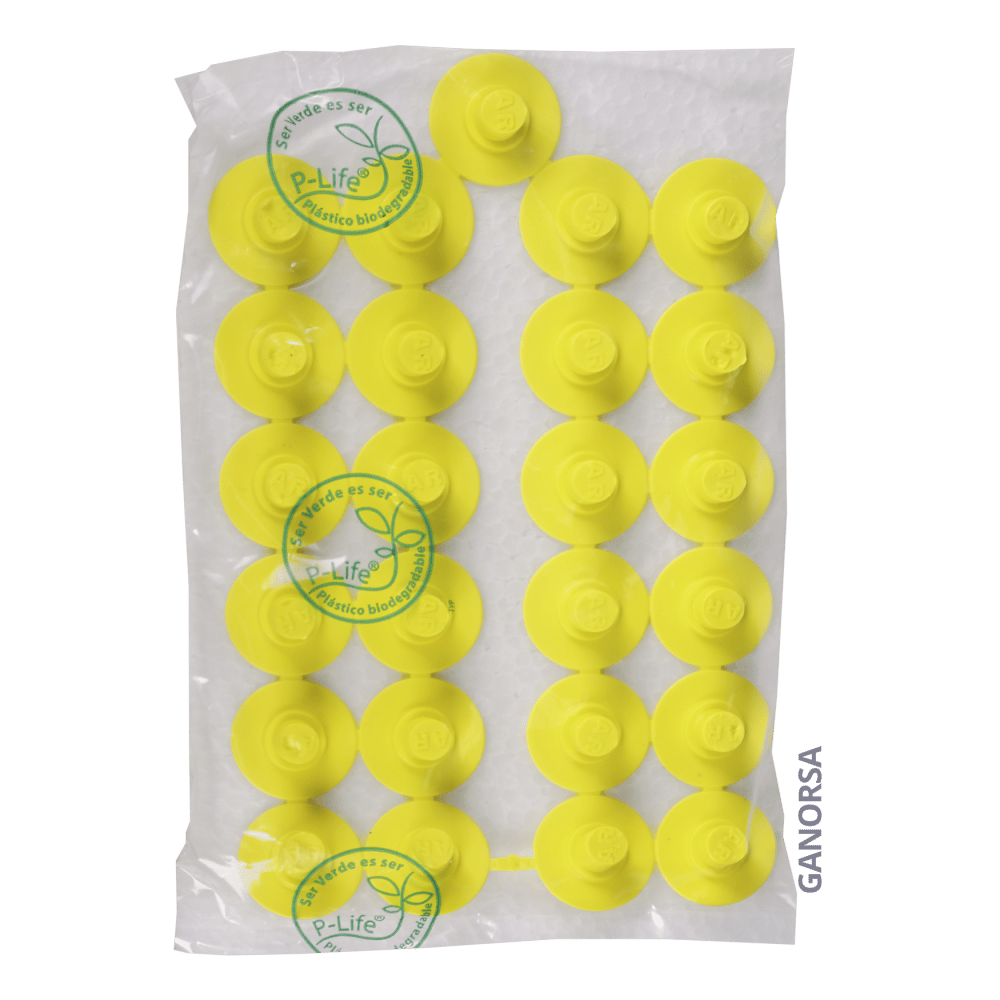 Inyectado en poliuretano termoplástico con punta metálica. La punta metálica aísla la aguja de la oreja del animal evitando la transmisión de enfermedades.